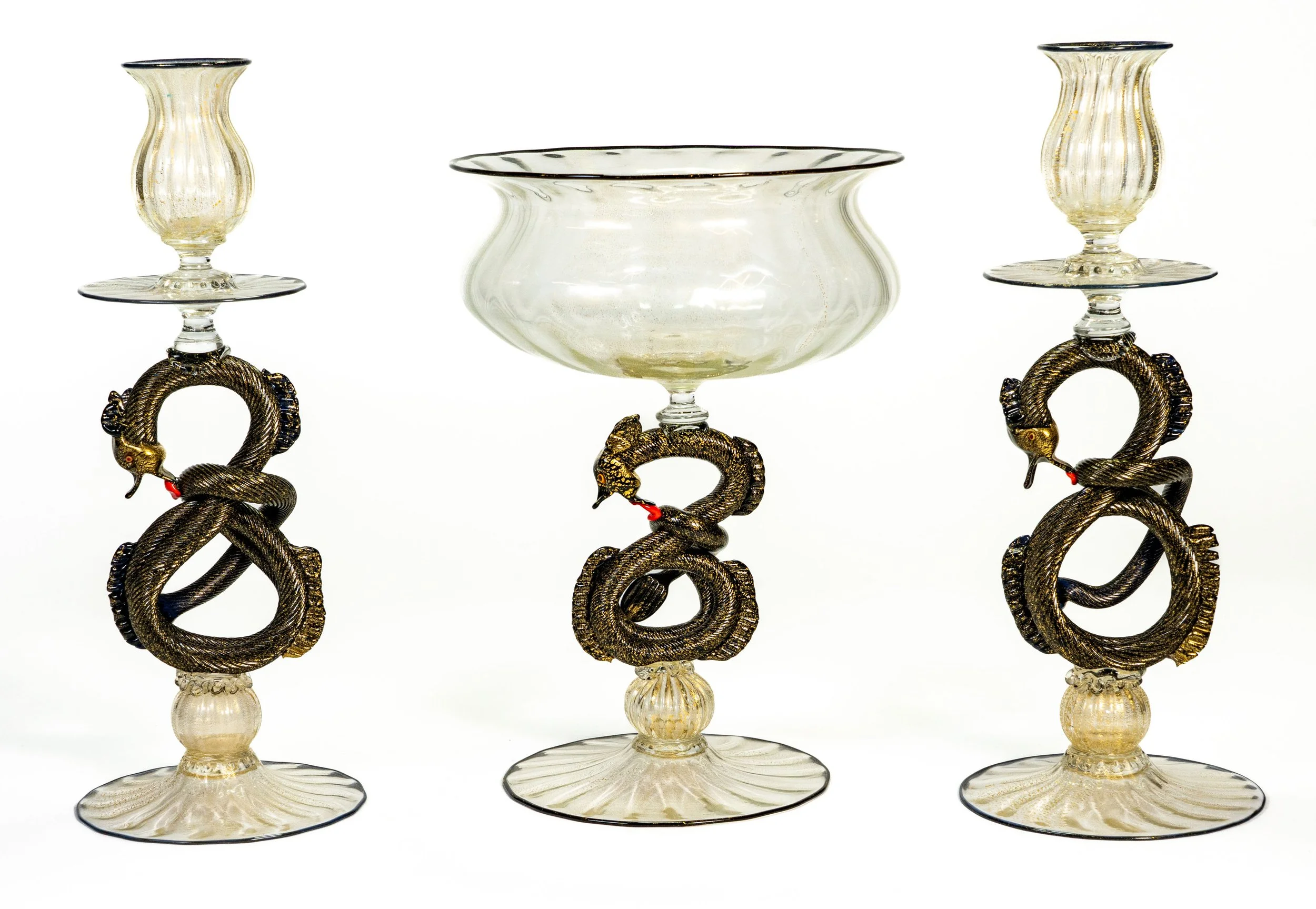 Additional offerings include striking lighting by Angelo Lelli, Mario Barbaglia, and John Cook; sterling silver by Tiffany, Gorham, and Whiting; and fine glass and porcelain by Murano, Lalique, Steuben, Herend, and Royal Dux.