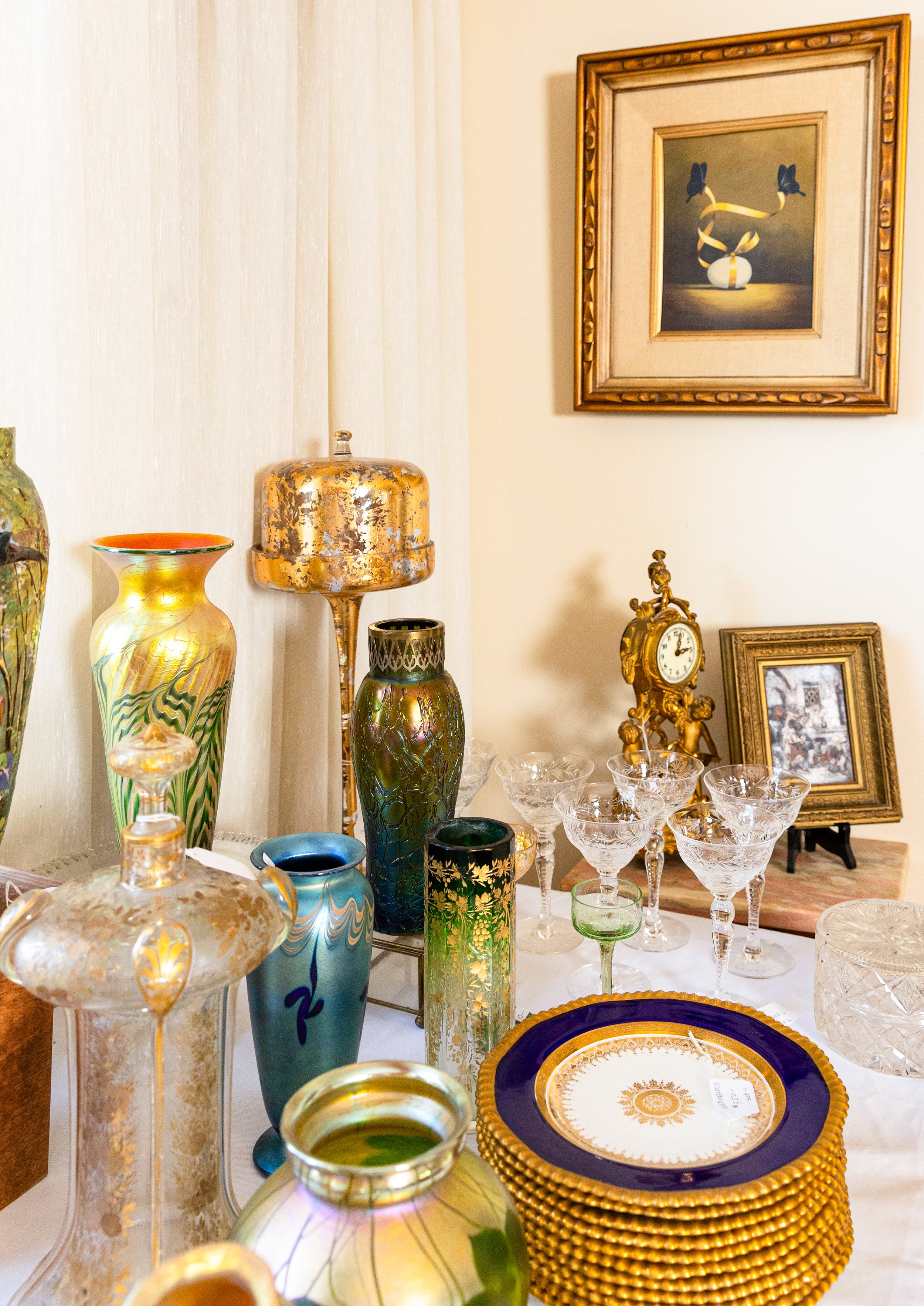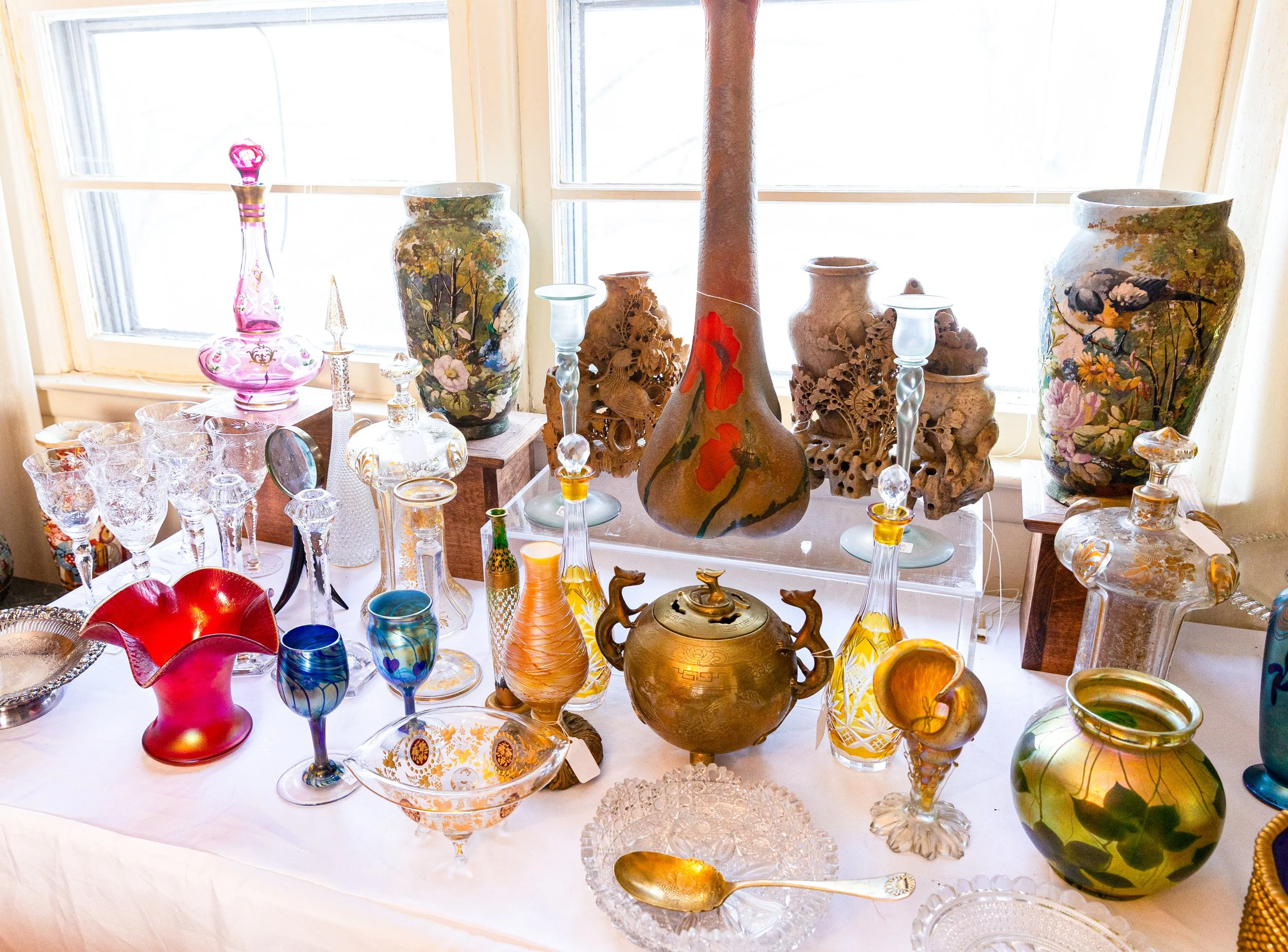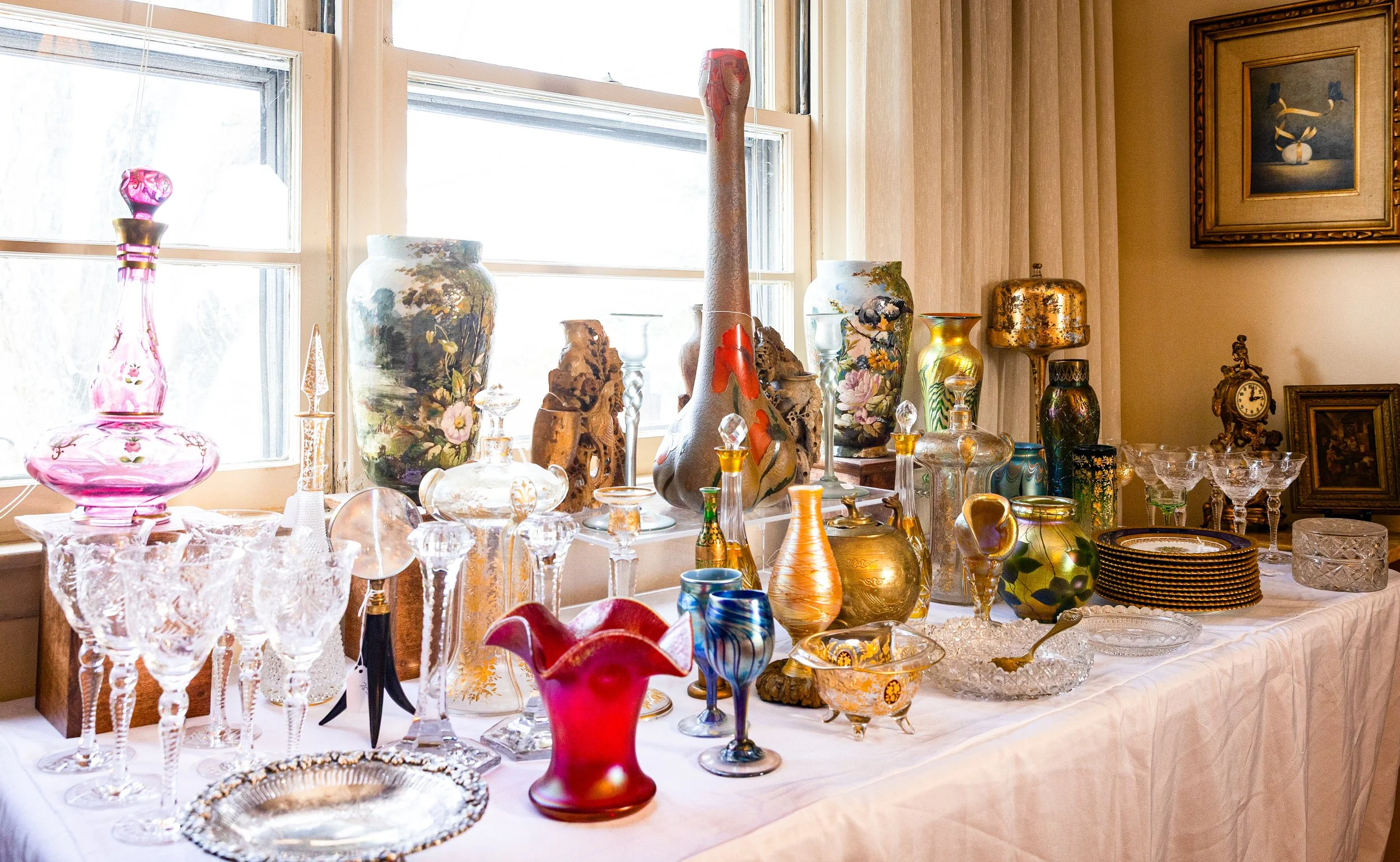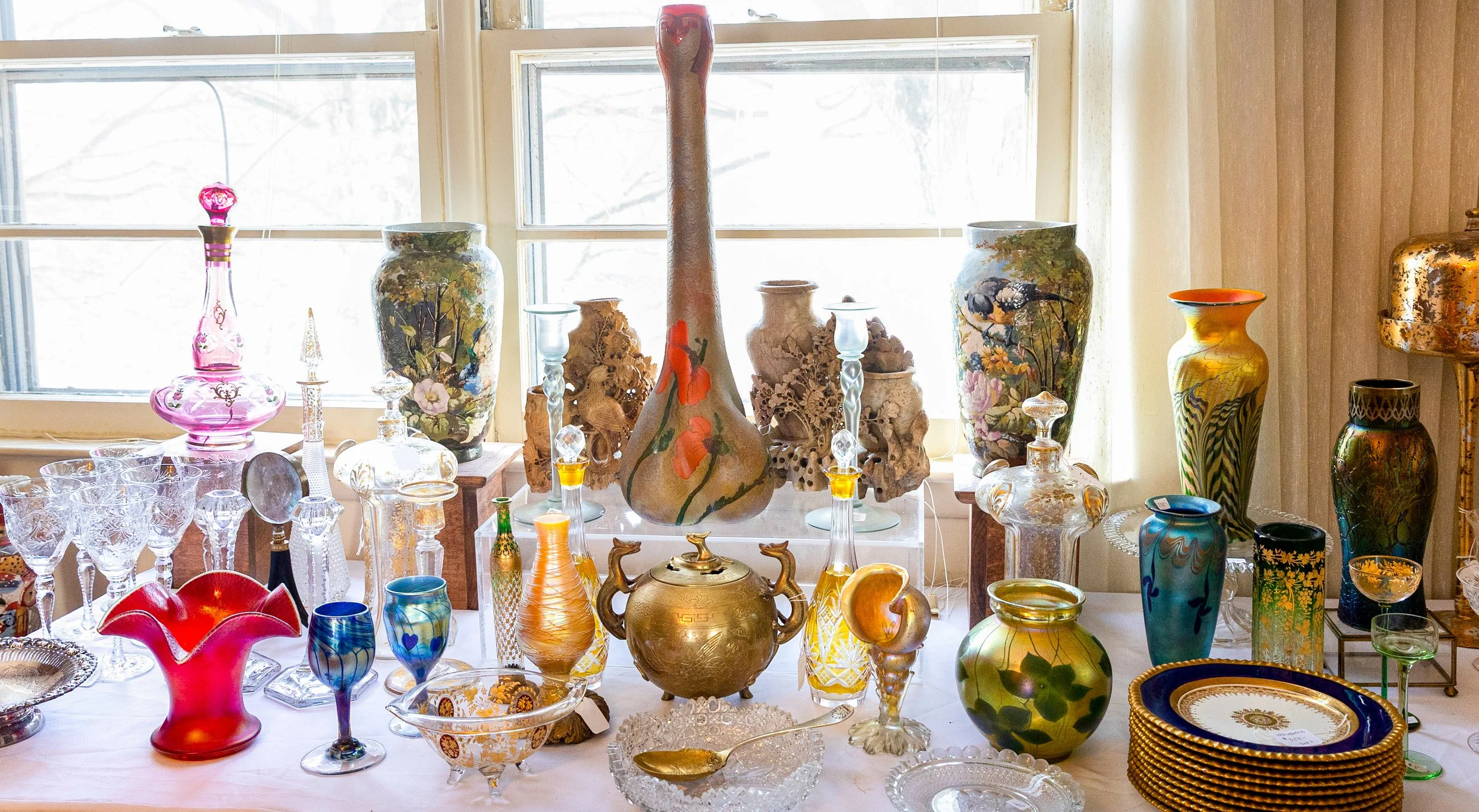 Highlights include an exceptional array of art glass and early American cut glass, featuring works by Tiffany, Quezal, Lundberg Studios, and Durand, as well as outstanding examples of American Brilliant cut glass. Collectors will also find a substantial selection of clocks, antique lighting, and bronze works.