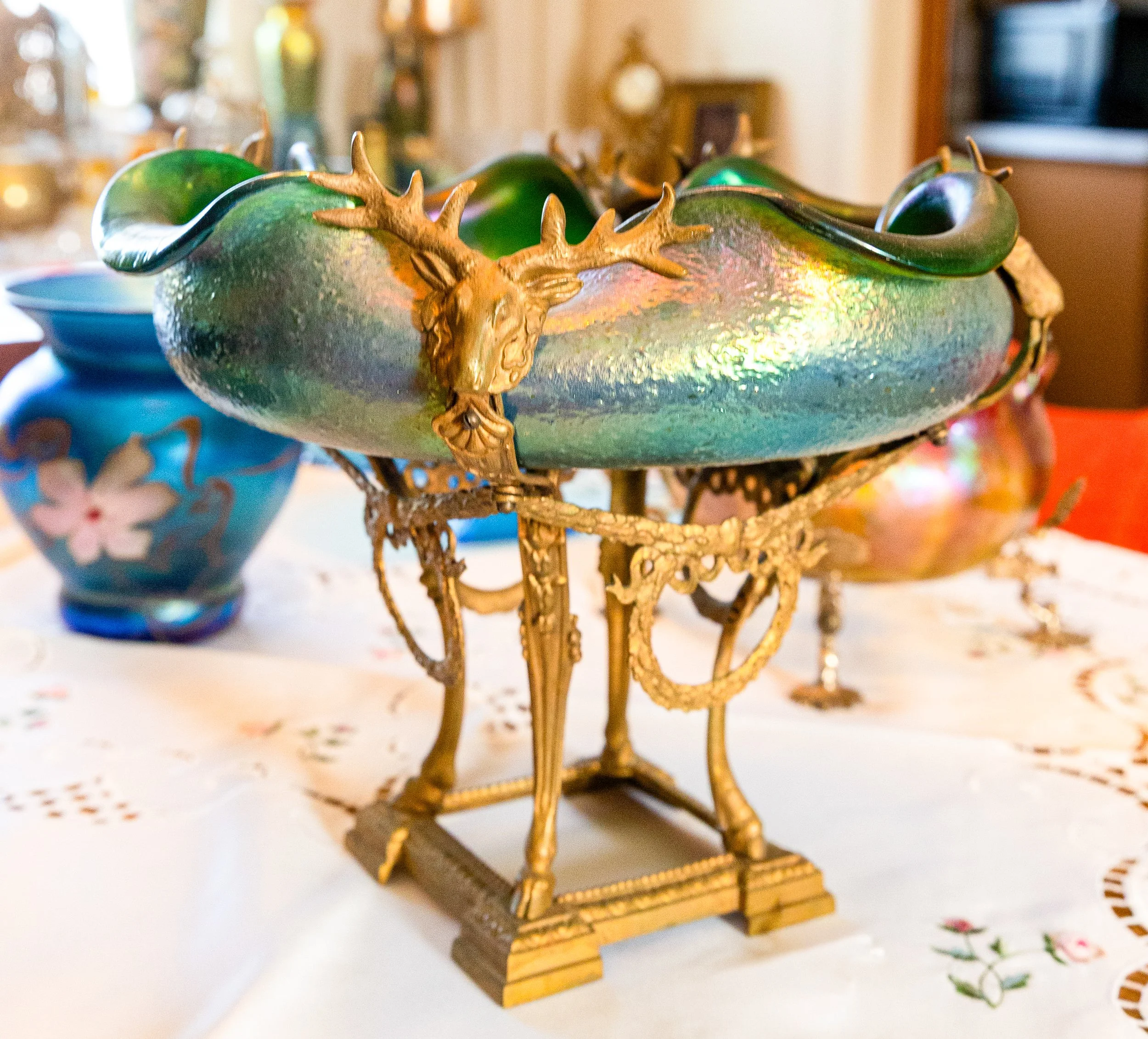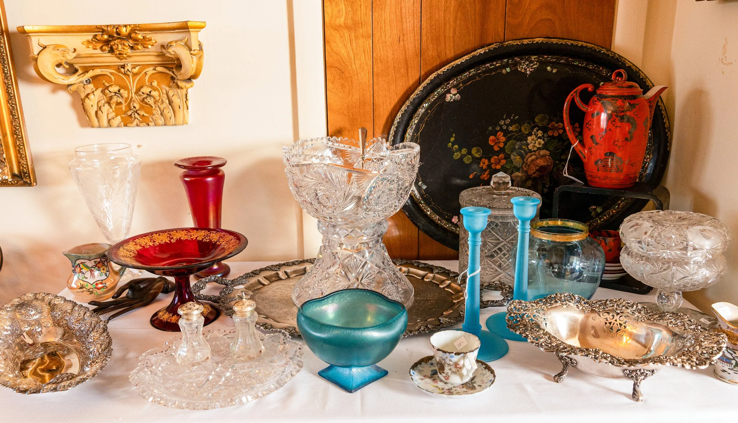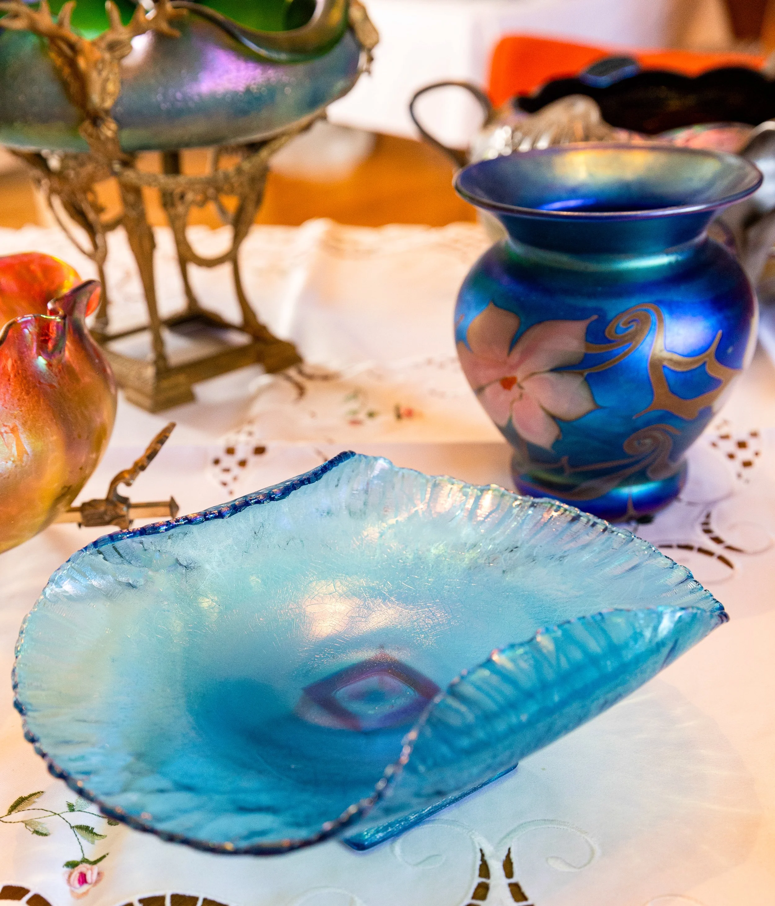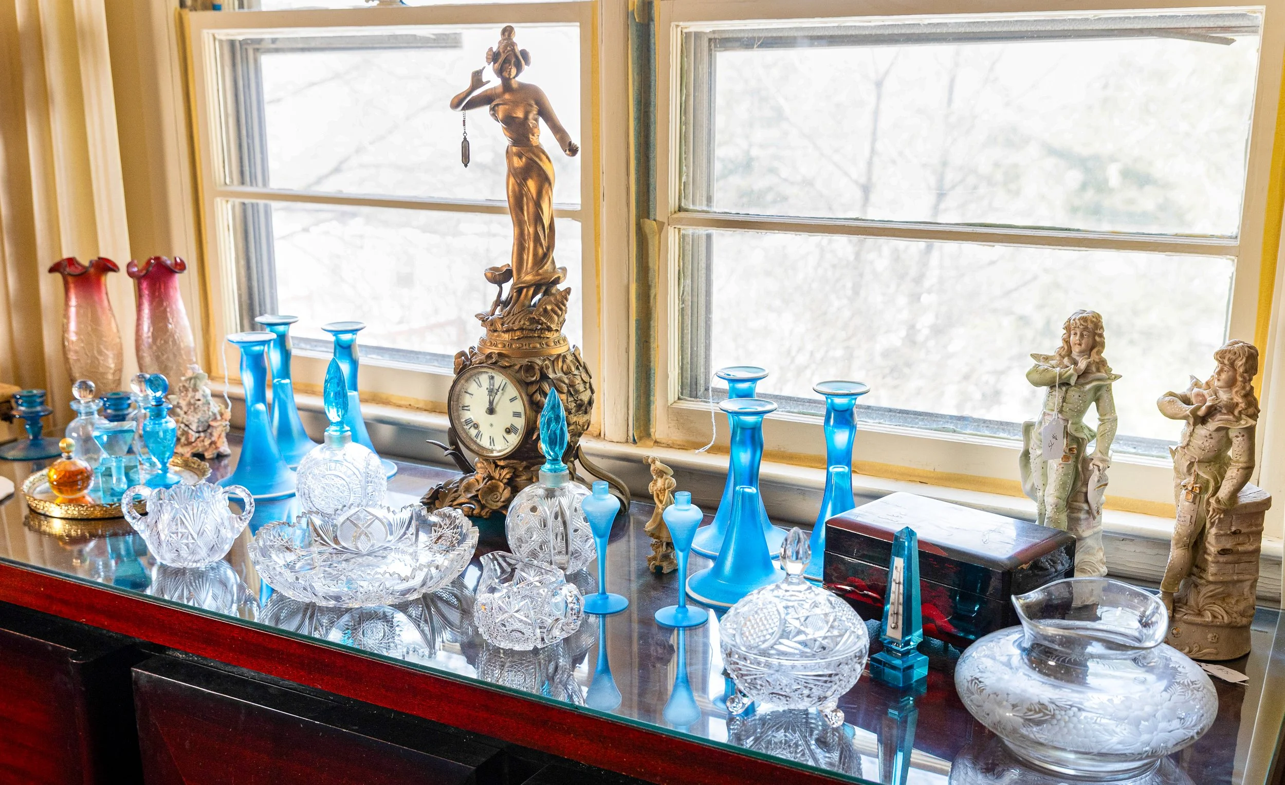 Highlights include an exceptional array of art glass and early American cut glass, featuring works by Tiffany, Quezal, Lundberg Studios, and Durand, as well as outstanding examples of American Brilliant cut glass. Collectors will also find a substantial selection of clocks, antique lighting, and bronze works.