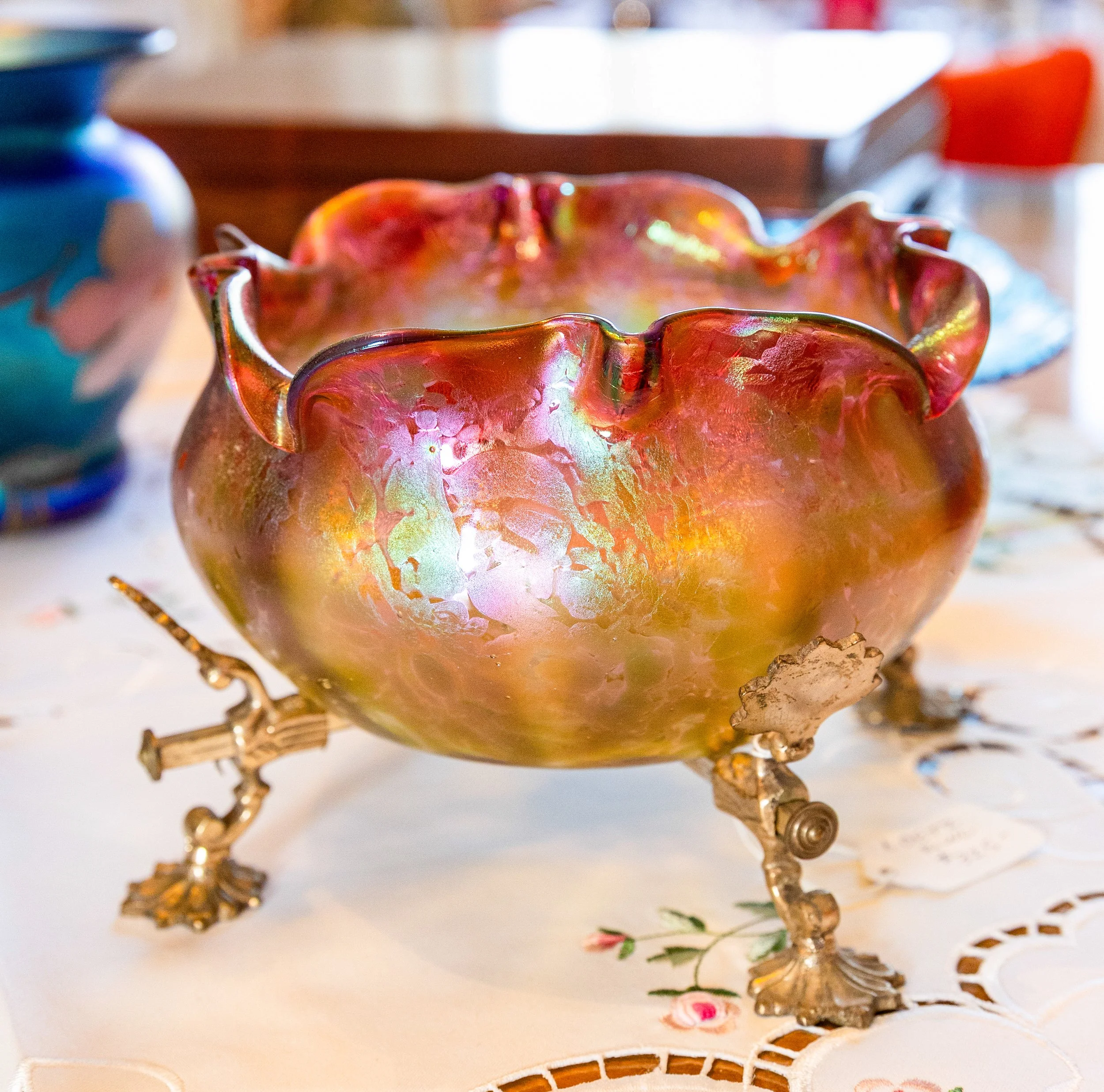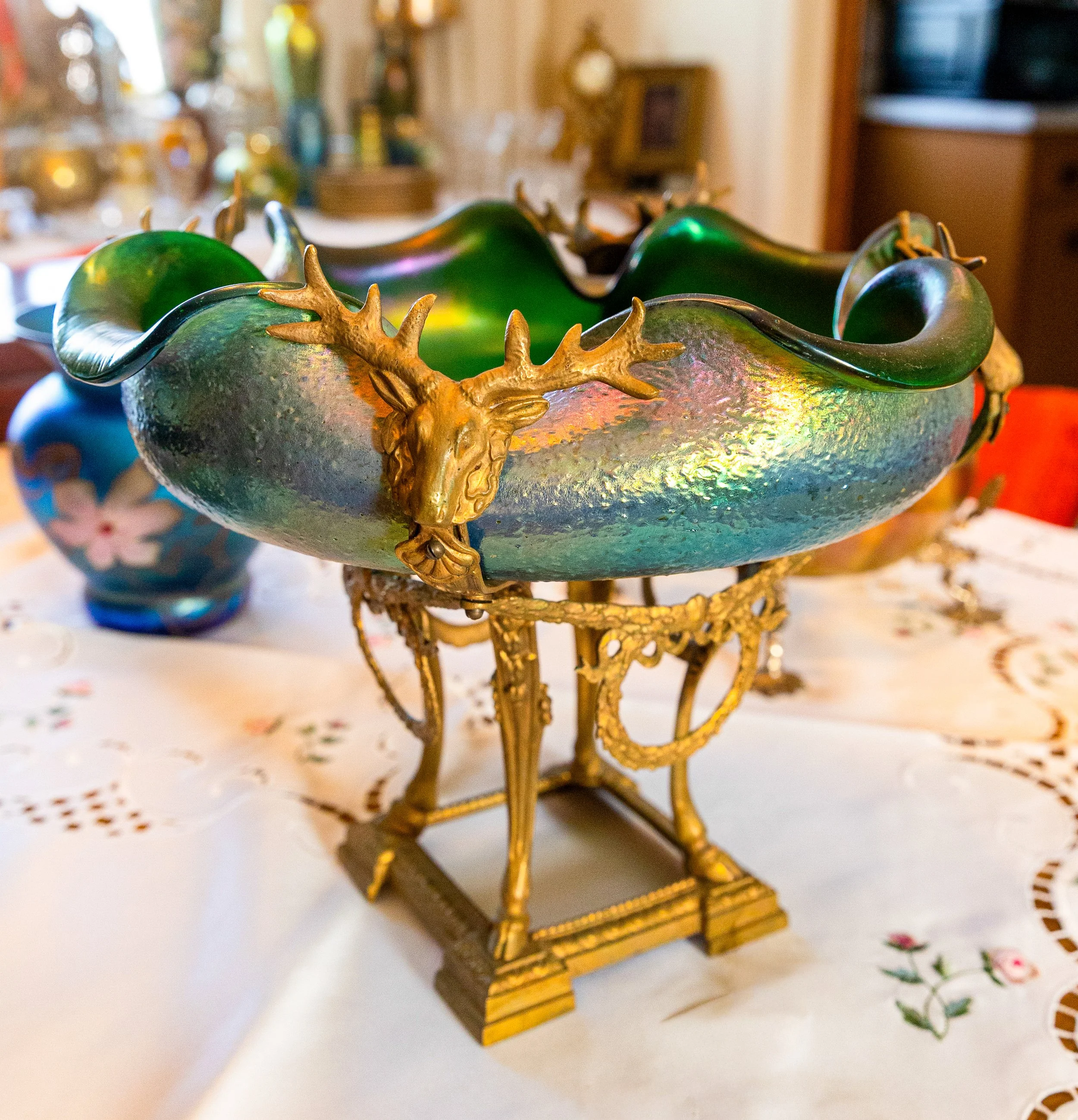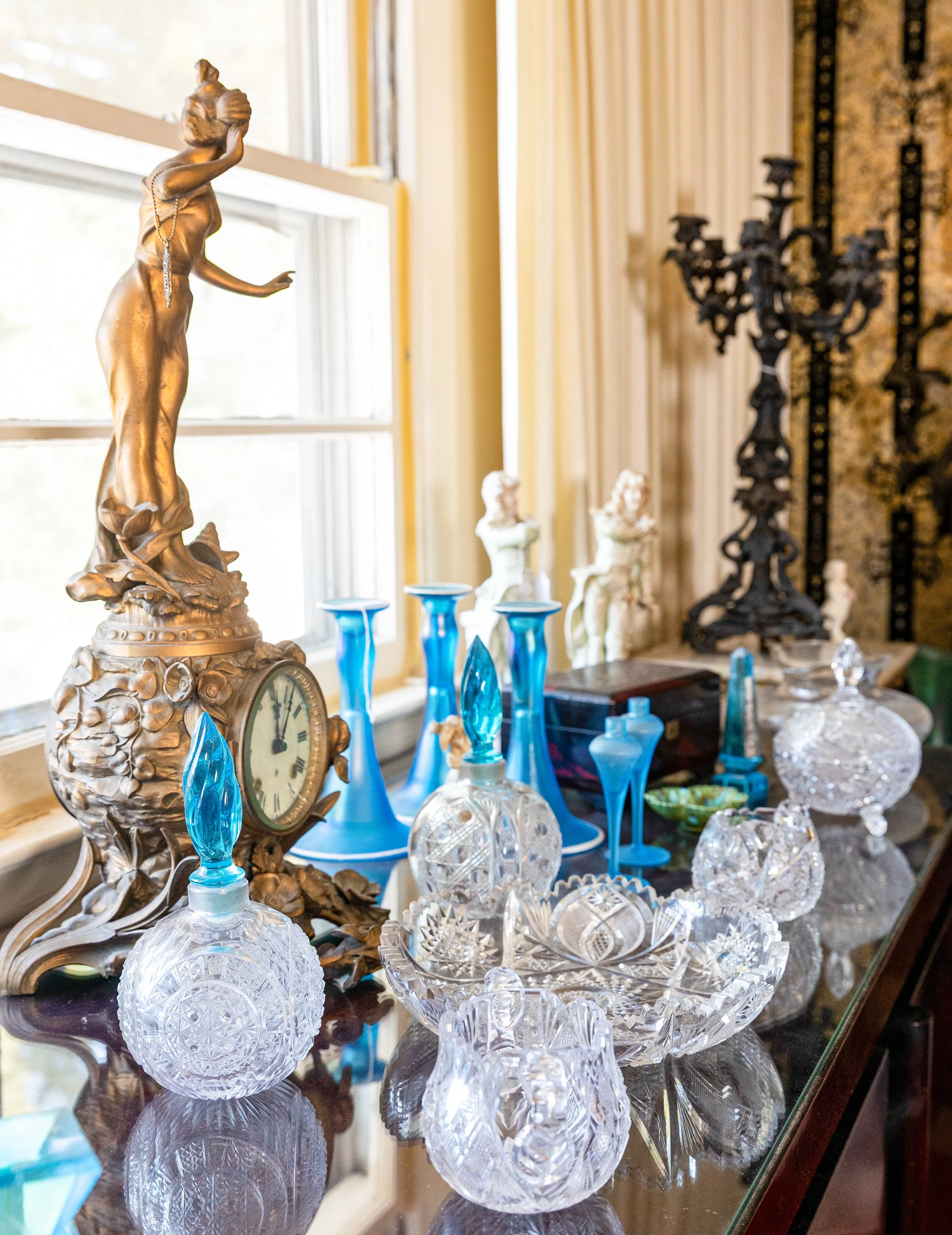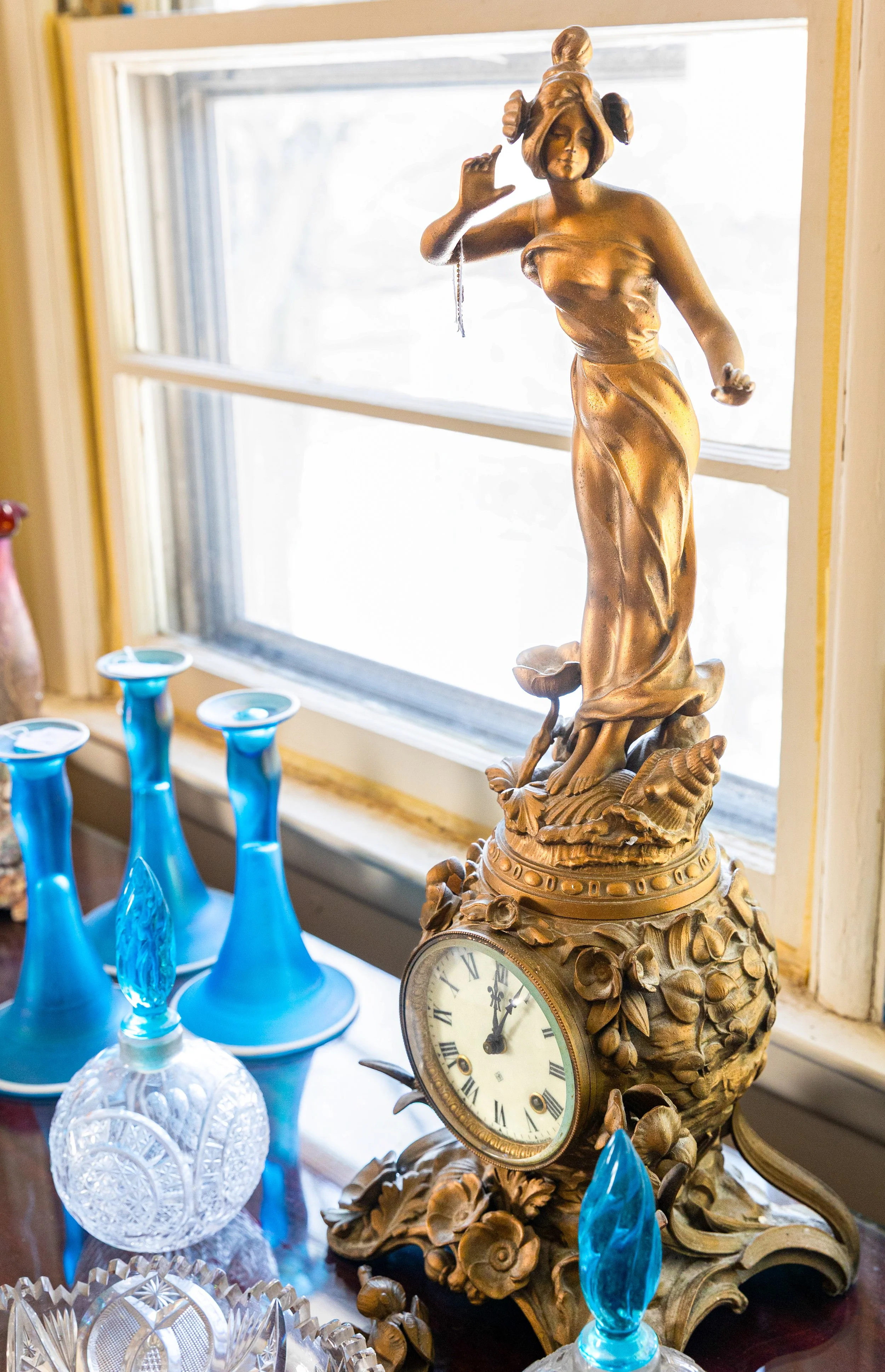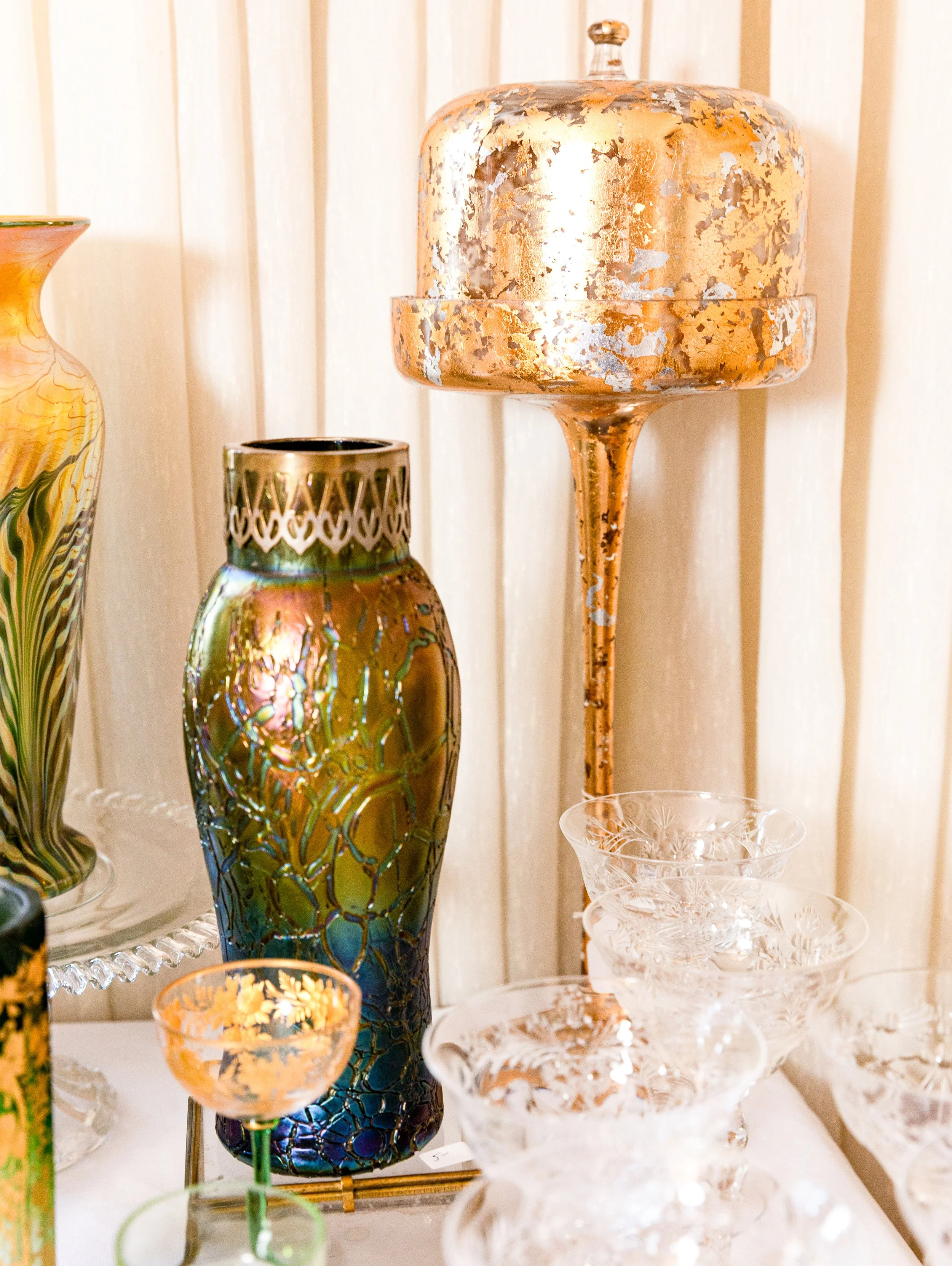 Highlights include an exceptional array of art glass and early American cut glass, featuring works by Tiffany, Quezal, Lundberg Studios, and Durand, as well as outstanding examples of American Brilliant cut glass. Collectors will also find a substantial selection of clocks, antique lighting, and bronze works.