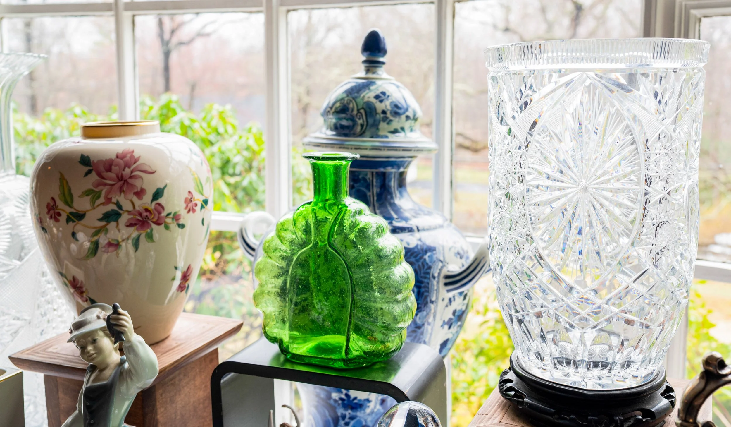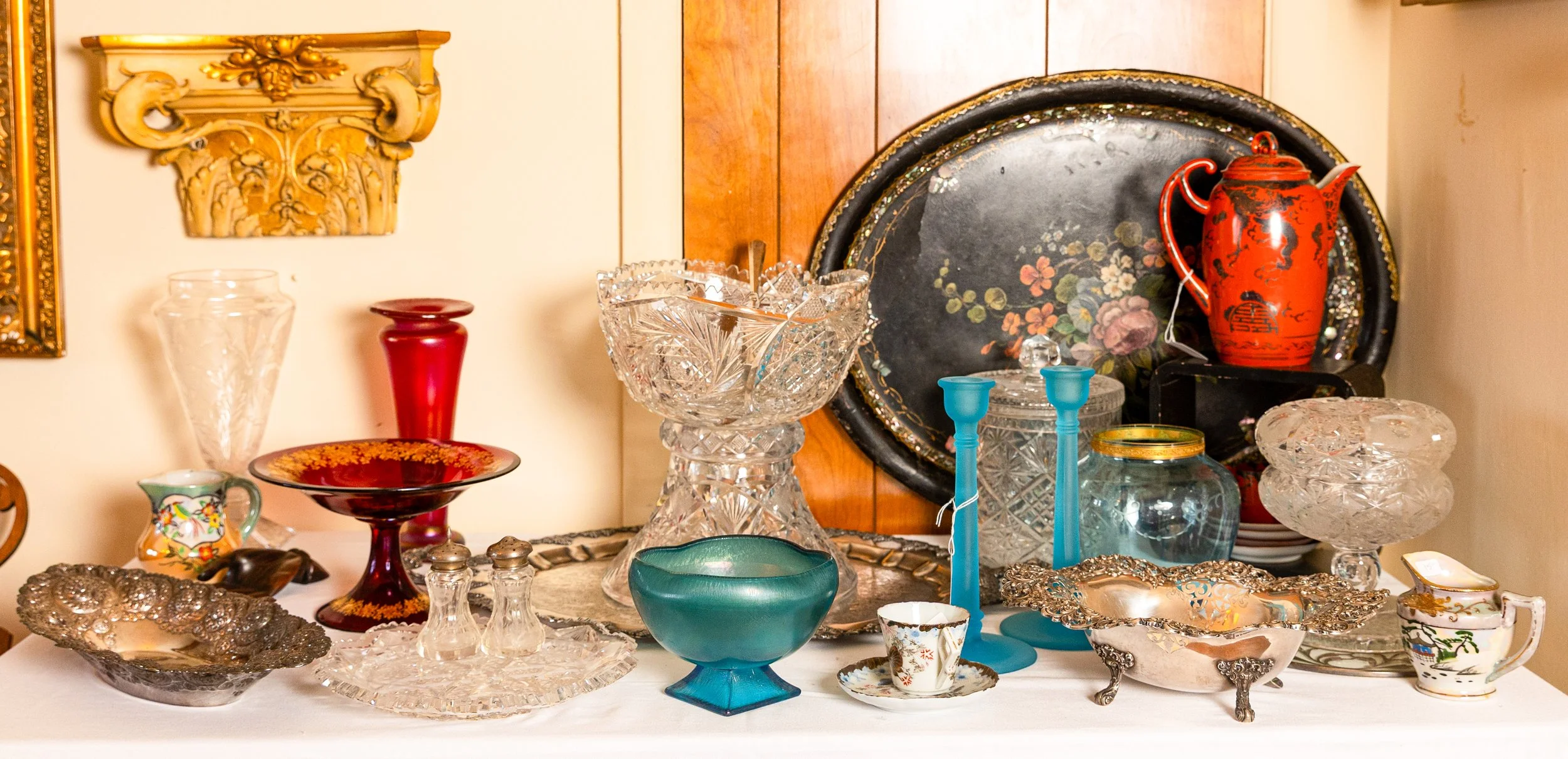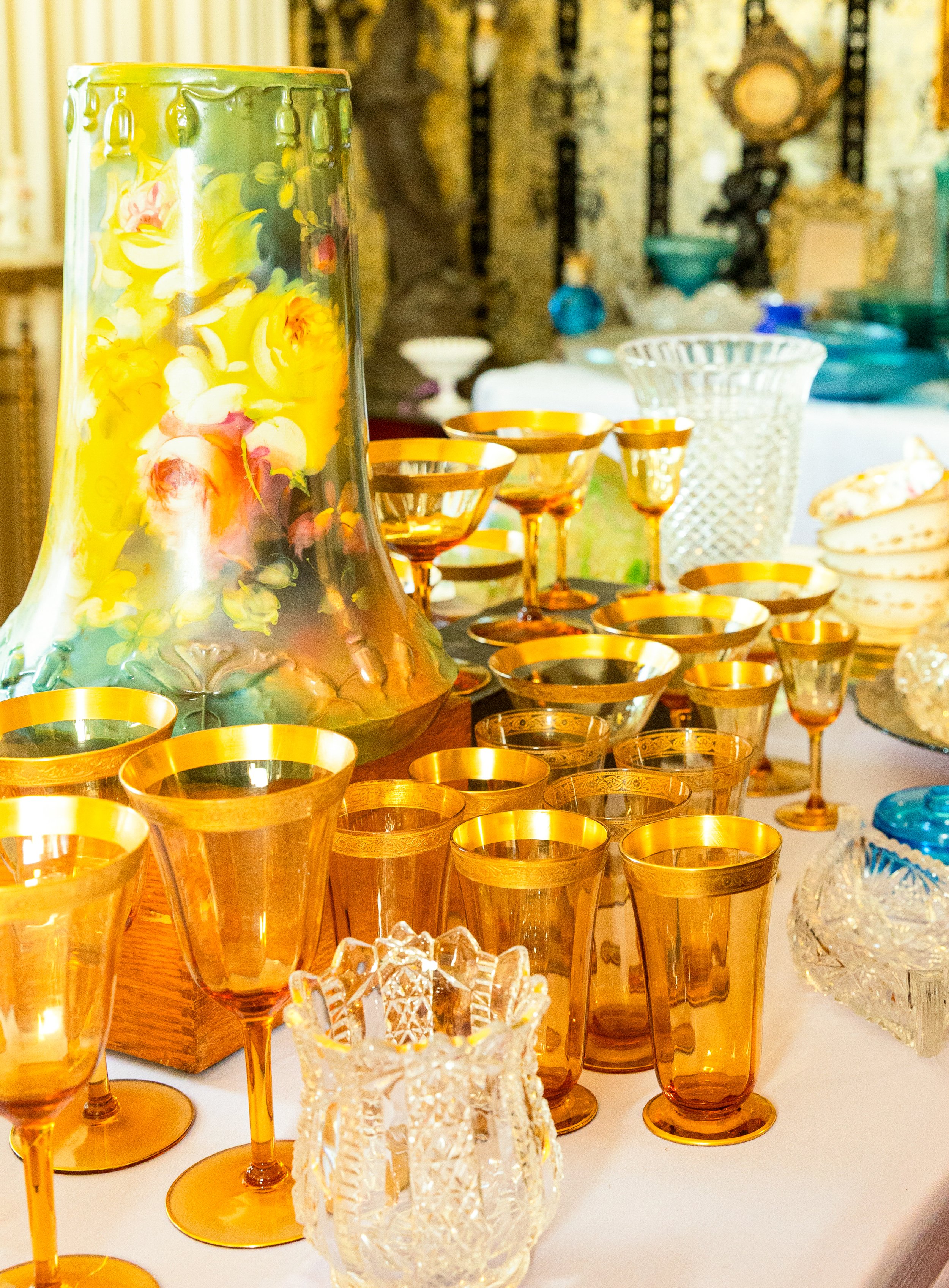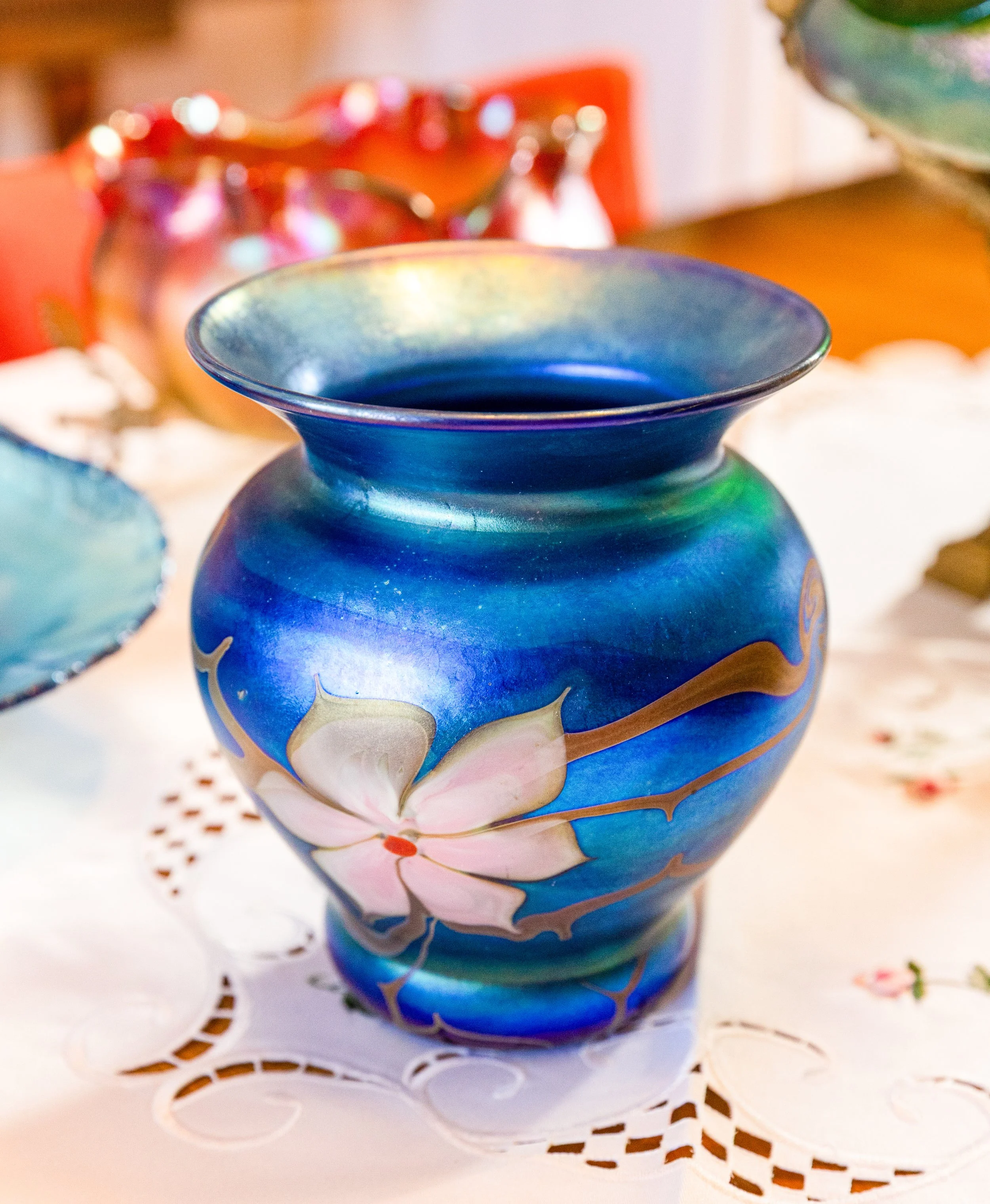 Highlights include an exceptional array of art glass and early American cut glass, featuring works by Tiffany, Quezal, Lundberg Studios, and Durand, as well as outstanding examples of American Brilliant cut glass. Collectors will also find a substantial selection of clocks, antique lighting, and bronze works.