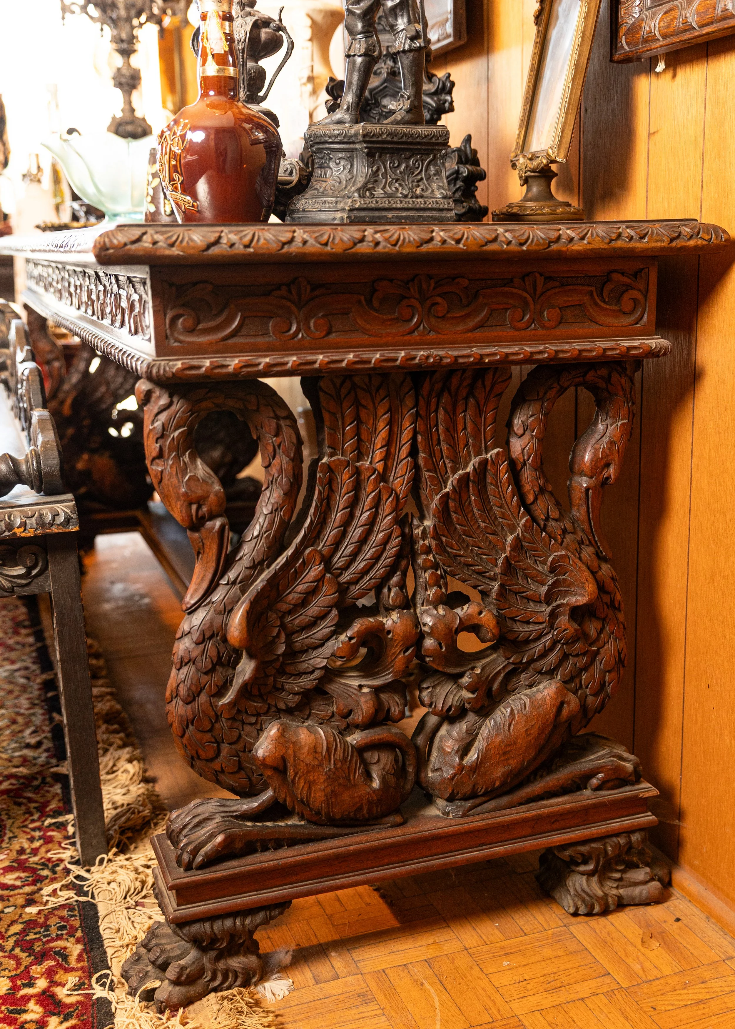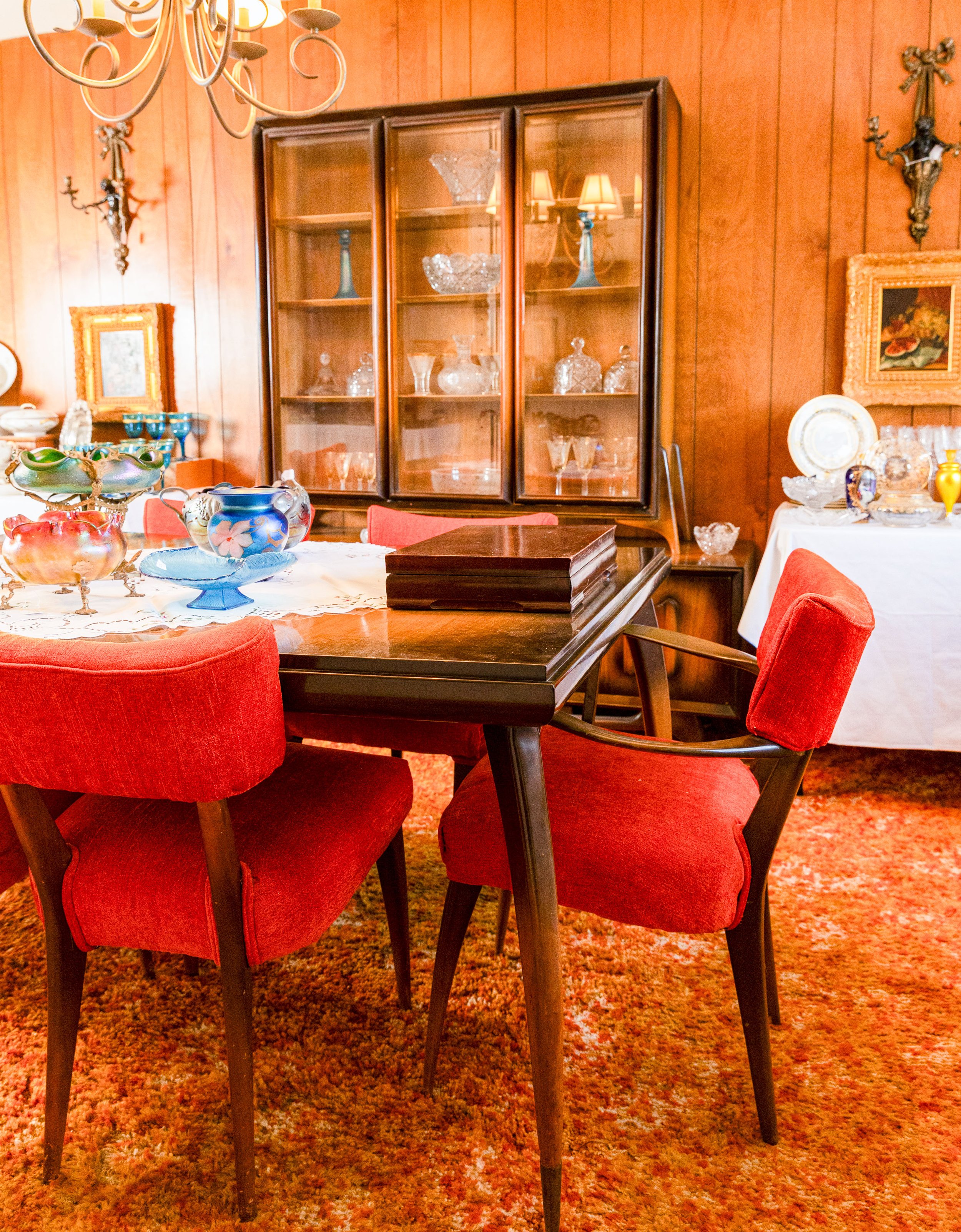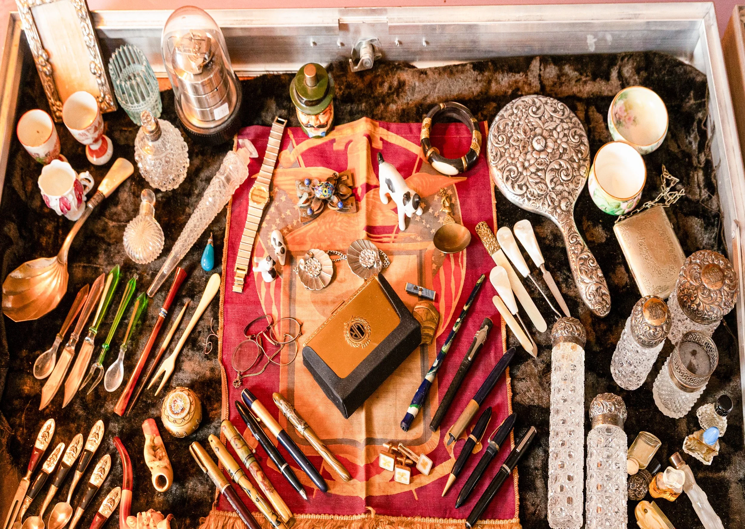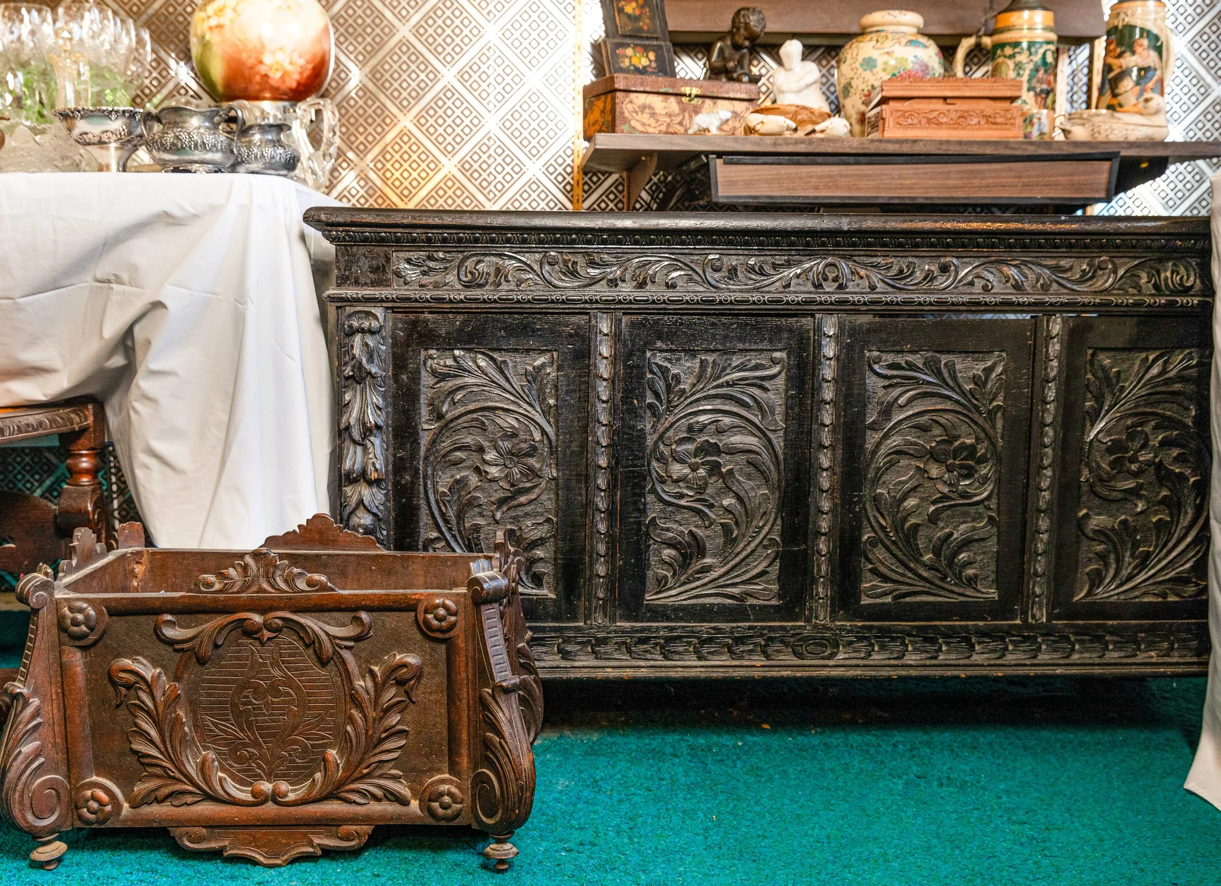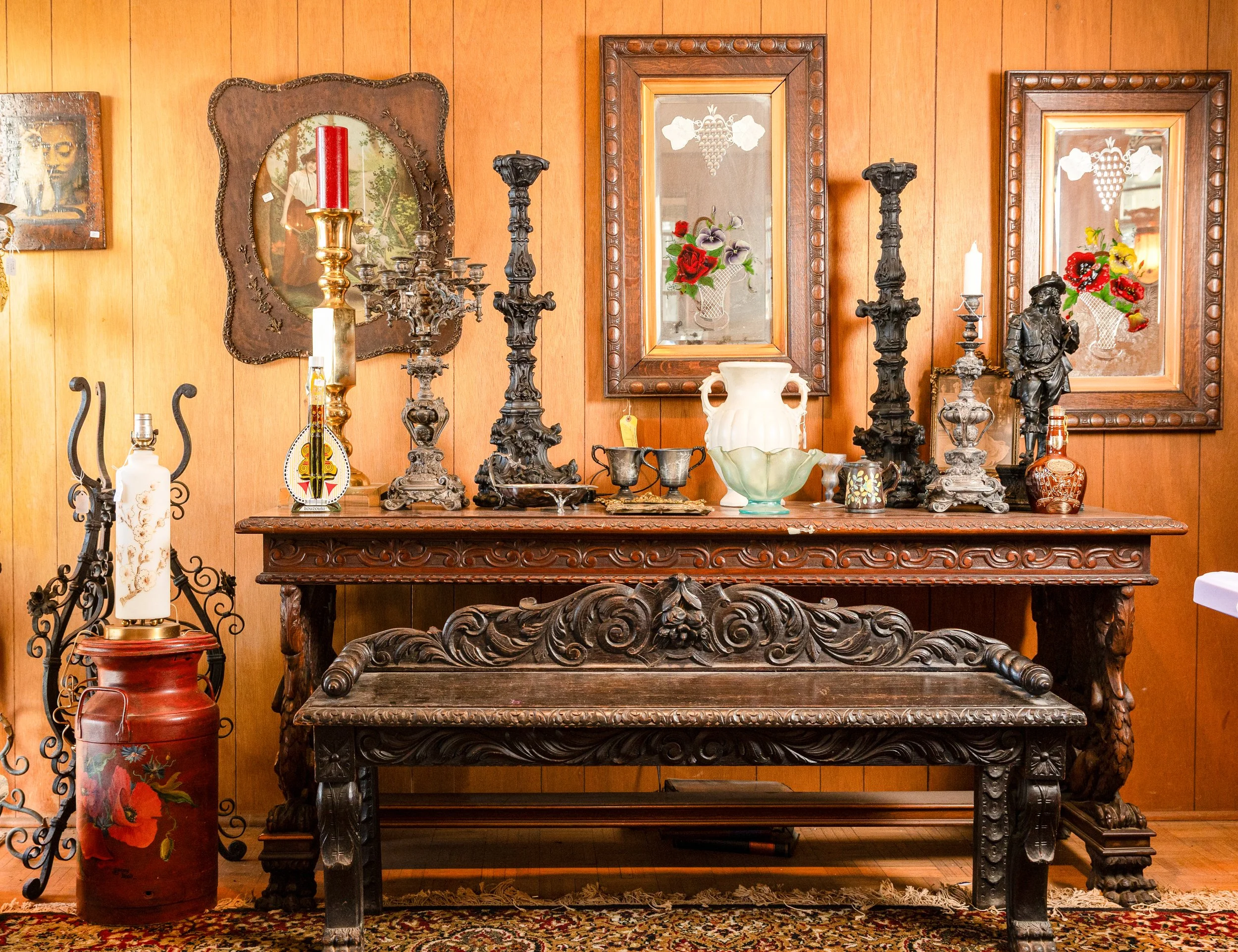 Other featured treasures include hand-knotted rugs, an Edison Opera phonograph, a Singer portable sewing machine, and even a full-size carousel horse.