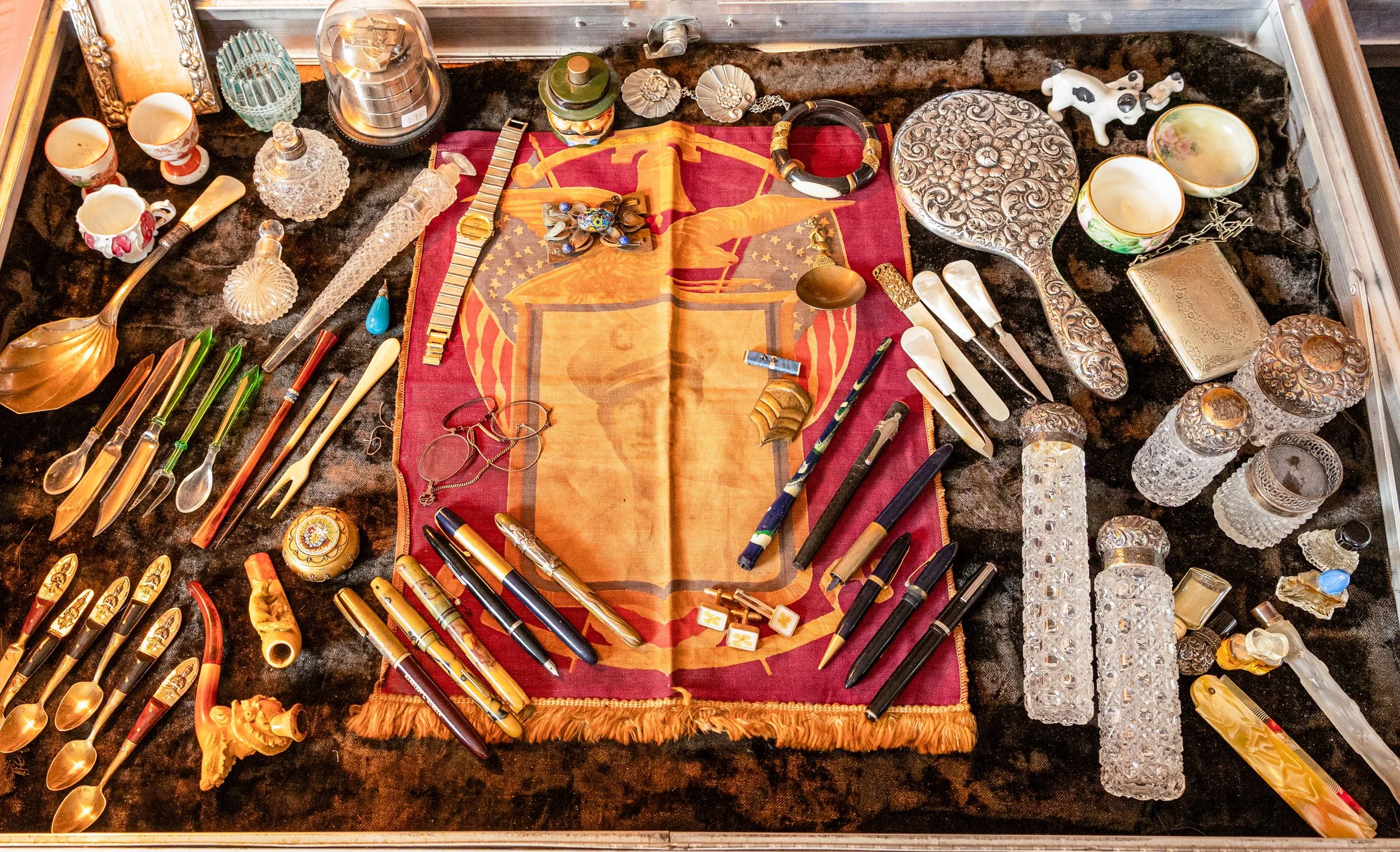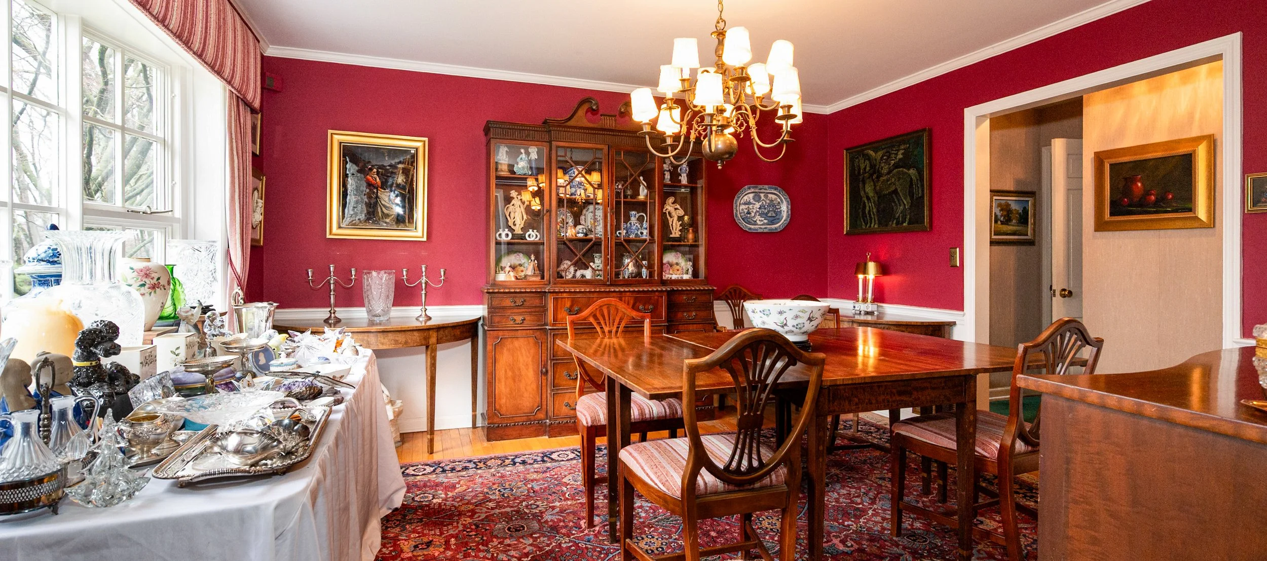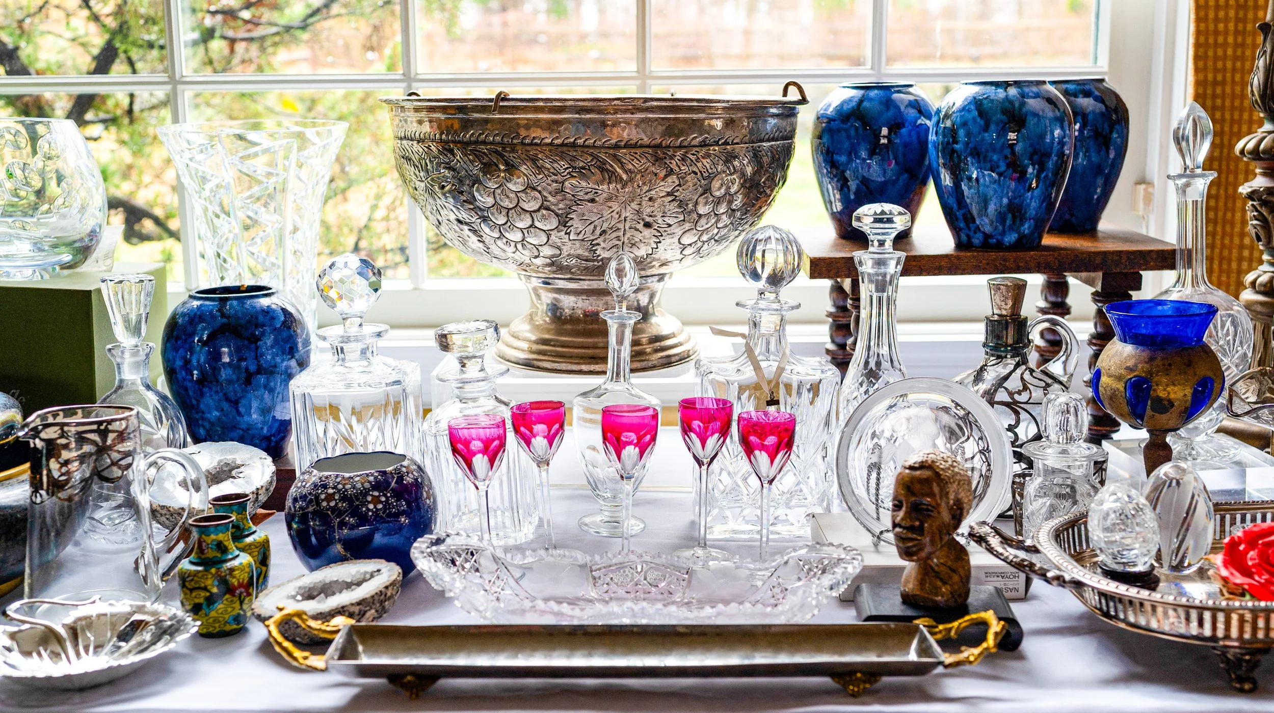 This lovingly assembled collection of international tastes features a beautiful array of textiles, antiques and objects from around the world, including China, Russia, England, Turkey and more. The collectors’ fine taste in artwork, hand-knotted rugs, books, furniture and women’s fashion is everywhere on display in this wonderful estate sale. Hawkes, Baccarat and Waterford Crystal, multiple sets of china, fine and costume jewelry, antique furniture and more.