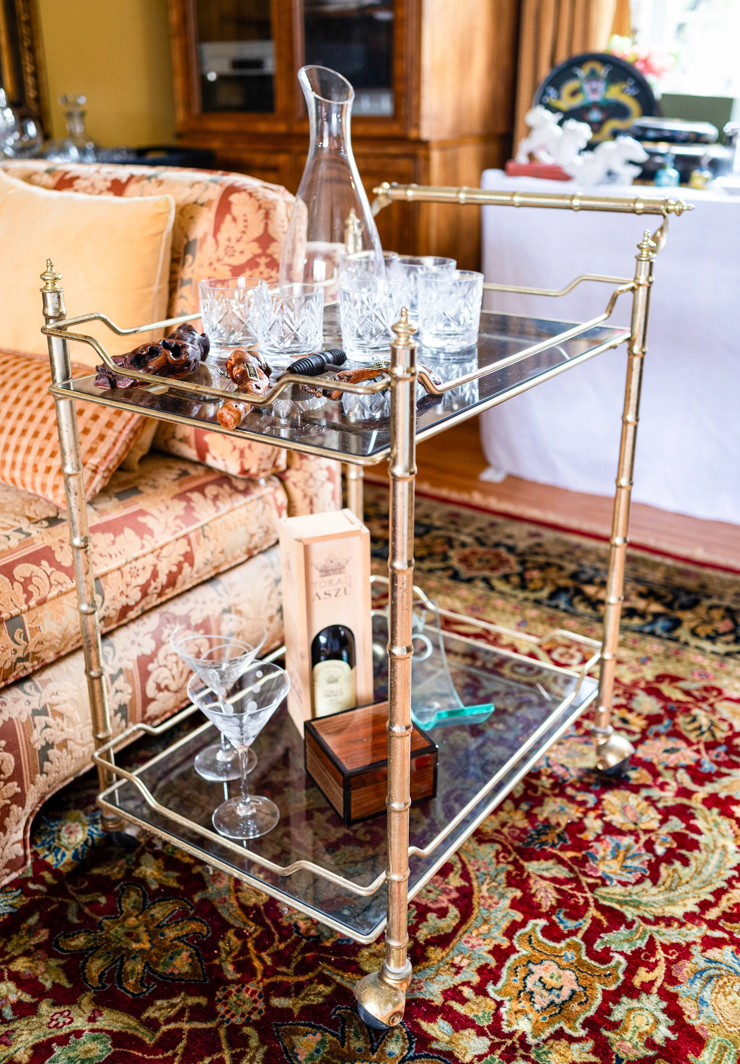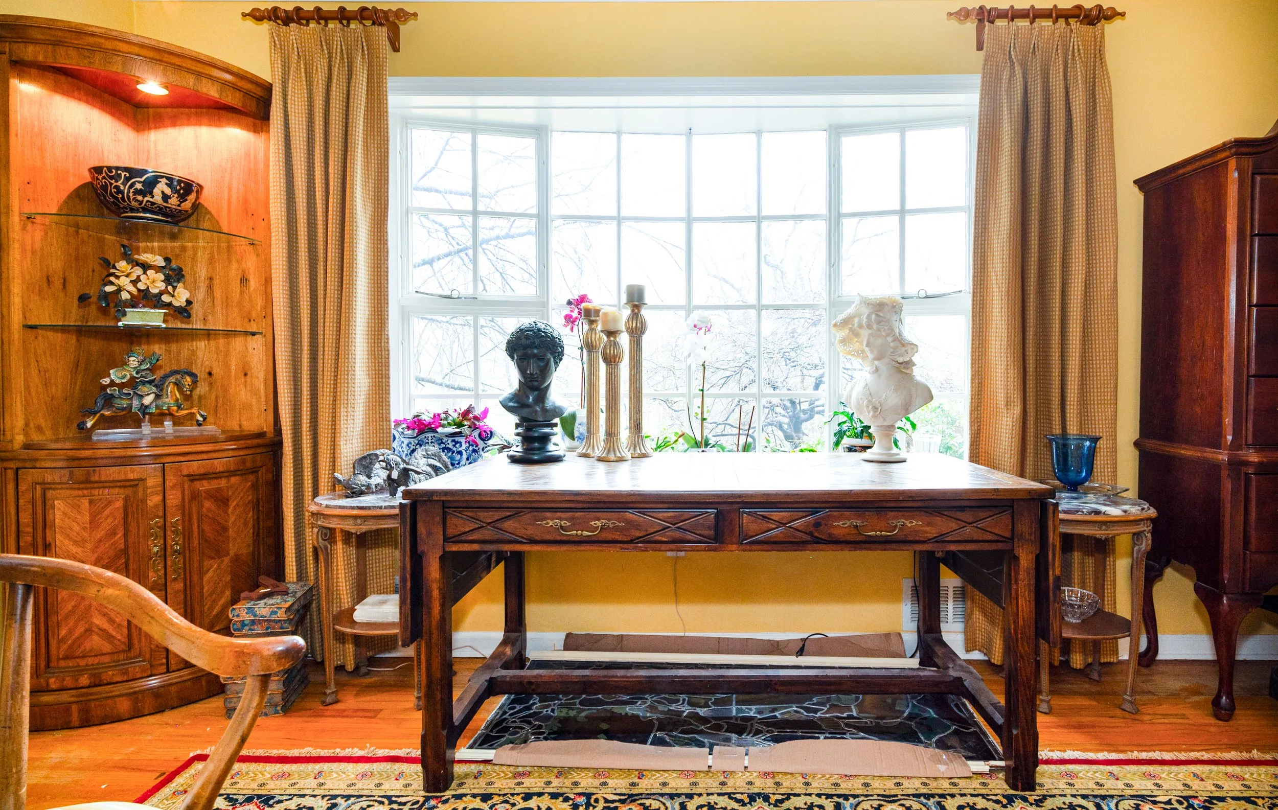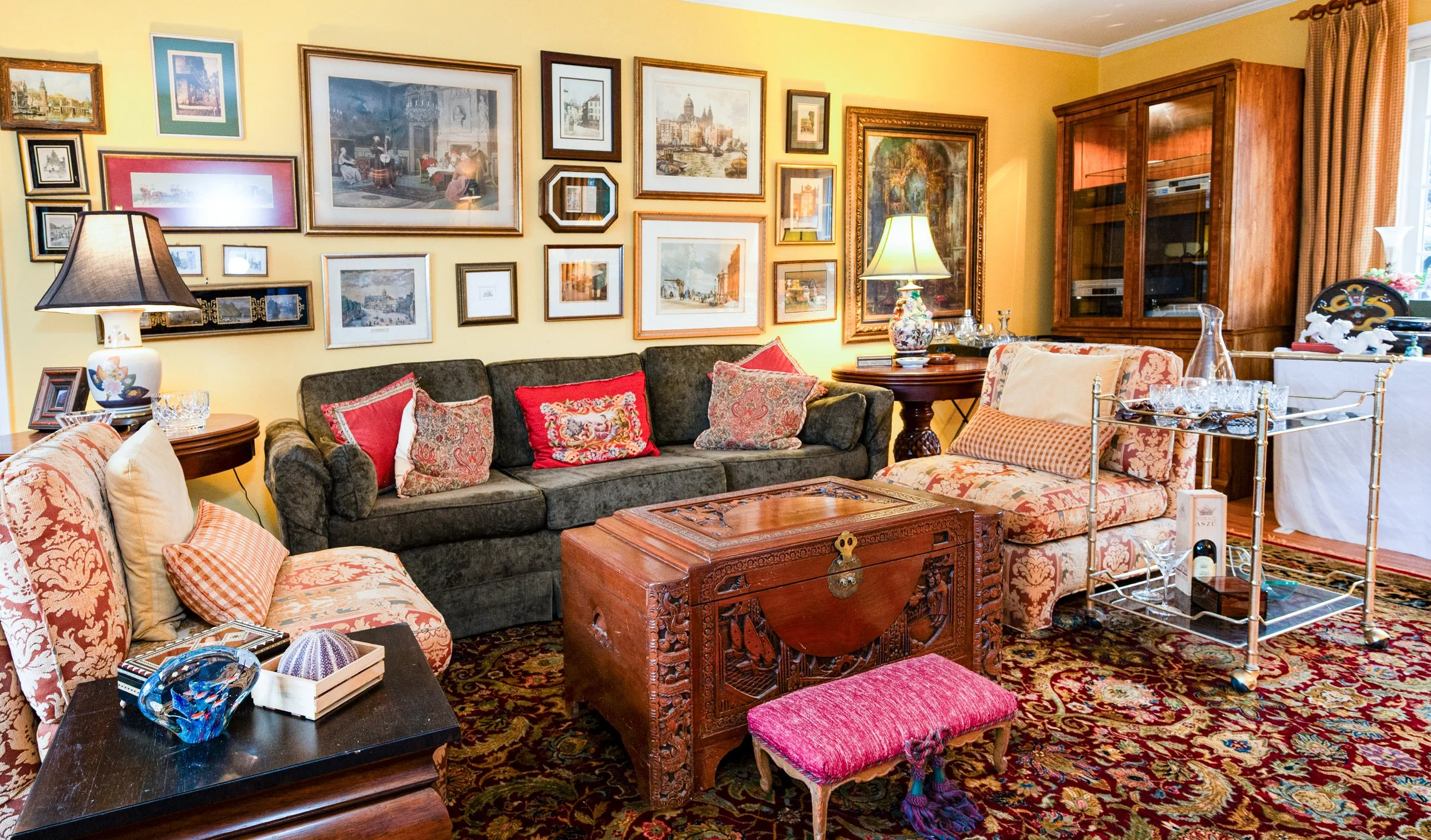 This lovingly assembled collection of international tastes features a beautiful array of textiles, antiques and objects from around the world, including China, Russia, England, Turkey and more. The collectors’ fine taste in artwork, hand-knotted rugs, books, furniture and women’s fashion is everywhere on display in this wonderful estate sale. Hawkes, Baccarat and Waterford Crystal, multiple sets of china, fine and costume jewelry, antique furniture and more.