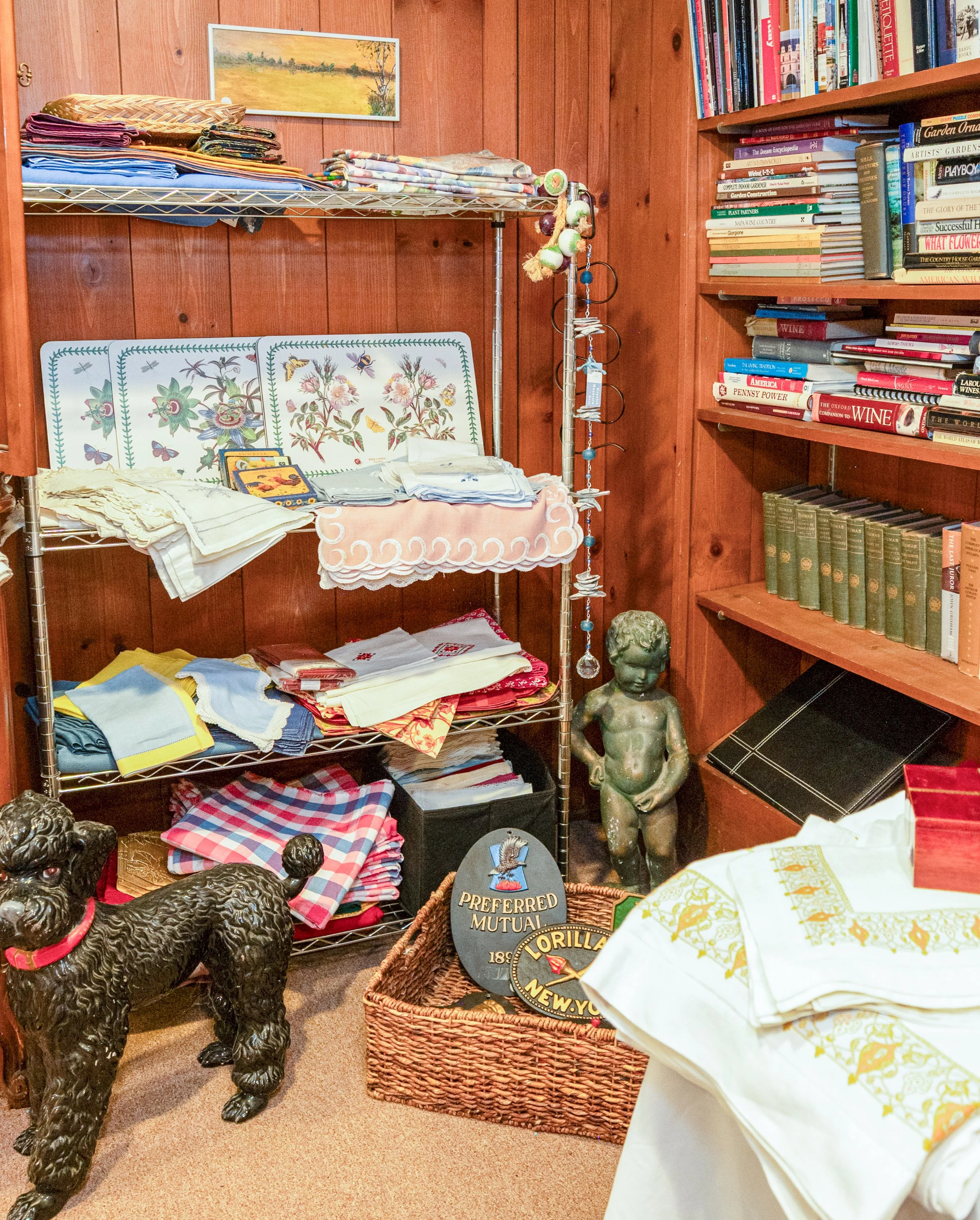 Additional highlights include original artwork by Demétre Chiparus, Gino Hollander, and William Cornelius Rip, antique maps and engravings, and a wide selection of oil paintings. Furnishings span antique to modern, including American Hepplewhite dining furniture, a Century drop-leaf table, Chinese carved trunk, brass and glass bar cart, leather sofa, and large desks, complemented by sterling silver tablewares, lighting, mirrors, vintage records, large Oriental rugs, patio furniture and garden statuary, books, ephemera, tools, and an extensive assortment of fine and vintage table linens.